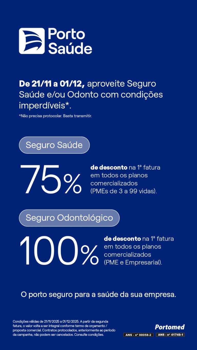 De 21/11 a 01/12, a Porto Saúde traz uma oportunidade incrível para os corretores de planos de saúde! Com 75% de desconto na primeira fatura dos planos de Saúde e 100% de desconto nos planos Odontológicos, é hora de oferecer aos seus clientes a melhor cobertura com condições imperdíveis. Não perca essa chance de se destacar no mercado!