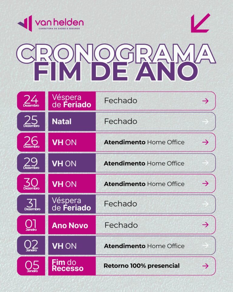 Prezado corretor, a Van Helden Corretora de Saúde e Seguros tem o prazer de compartilhar seu cronograma de atendimento para o fim de ano. Nos dias 24 e 25 de dezembro, estaremos fechados, celebrando o Natal. Entre os dias 26 e 30 de dezembro, nosso atendimento será realizado de forma Home Office, garantindo que você continue a contar com nosso suporte. Nos dias 31 de dezembro e 1 de janeiro, também estaremos fechados, reabrindo no dia 2 de janeiro em regime Home Office. A partir do dia 5 de janeiro, retornaremos ao atendimento 100% presencial. Agradecemos pela parceria e estamos sempre aqui para ajudá-lo!